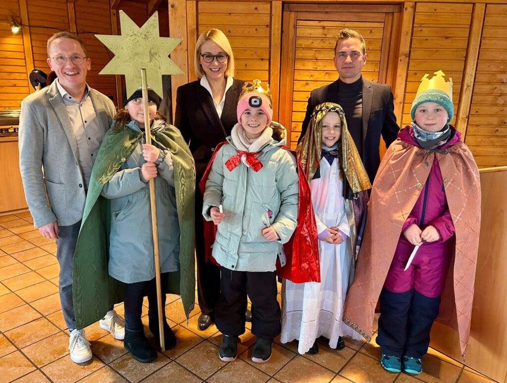 Michael Lührmann (Bürgermeisterkandidat CDU/CDW, Oberbürgermeisterin Katharina Pötter und Fraktionsvorsitzender Christian Schiffbänker mit dem spontanen Besuch der hl. Drei Könige. Foto: Matthias Owerrin